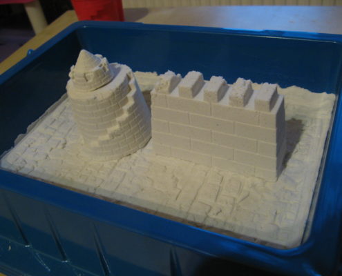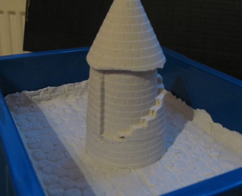 I najważniejsze – Super Sand świetnie sprawdza się do zabawy w domu. Deszczowy poranek lub mroźne popołudnie nie stanowią już przeszkody do rozłożenia piaskownicy. W zestawie „zamek”, który dostałem do recenzji, znajduje się pojemnik do zabawy i przechowywania piasku i akcesoriów. Są również foremki do ulepienia elementów zamku:  wieży ze schodami, muru, stożkowego dachu. Ponadto kielnia i wałek, przy pomocy których można uformować trakt lub posadzkę na dziedzińcu. A wszystkie formy wychodzą wyraźne, odwzorowane w dokładnym szczególe. Przyznam, że bawiłem się piaskiem razem z córką i nawet nie zauważyłem jak przeleciała godzinka.