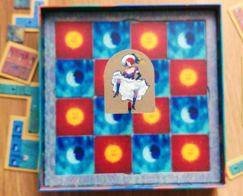 Wyłożenie zasad zajęło parę minut. Dno pudełka jest jednocześnie planszą (praktyczny pomysł). Mówię: