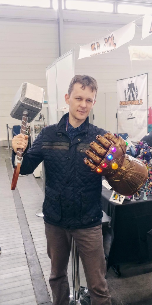 Okazało się, że w sieci są już podobne aukcje charytatywne. Stwierdziłem, że nie możemy być gorsi. Do aukcji dołożyłem kilka pomysłów: grę na pamiątkę, talon na zwycięską partię i inne rózności. Postanowiłem, że jako prezes stowarzyszenia muszę zaświecić twarzą i wybrałem swoje najbardziej geekowskie zdjęcie. Z rękawicą nieskończoności i młotem Thora. Nie bardzo wierzyłem, że akcja ma szanse na powodzenie. Damian był innego zdania.