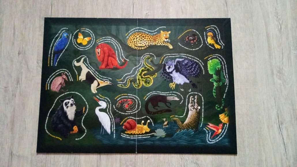Dzięki informacjom na odwrocie planszy gra ma walor edukacyjny. I bardzo podoba mi się, że nie sięgnięto po klasyczne zwierzaki, jak lew, żyrafa i hipopotam, tylko te mniej znane lub nawet przerażające (ptasznik brrr).