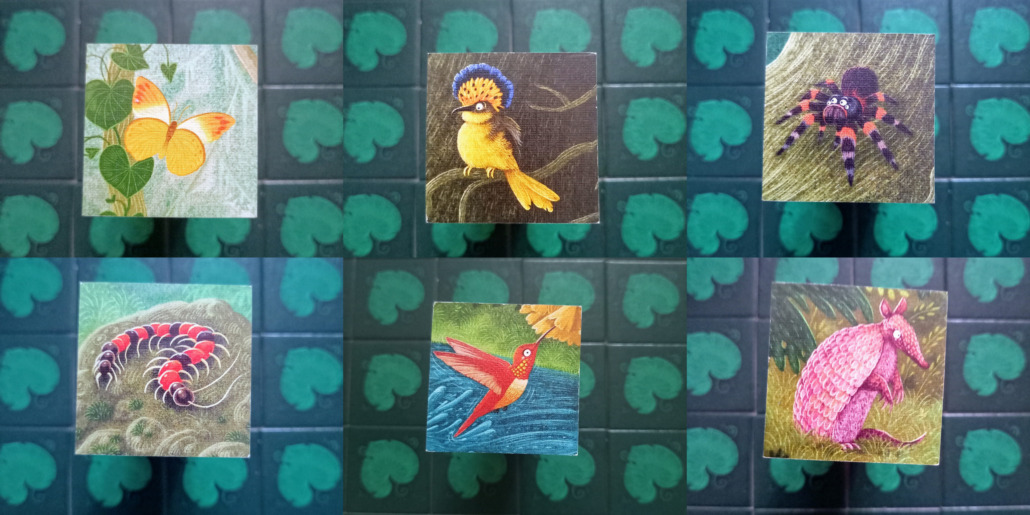 Od razu wyjaśnię: gra bazuje na mechanizmie zapamiętywania. Popularne memo zostało tutaj zaadaptowane w ciekawy sposób. Zakryte kafle gracze odkrywają pojedynczo, aż trafią na te z dołu planszy. Bo tam pierwsze dotarły promienie słońca. Jeśli masz już jakiś kawałek układanki na planszy, możesz budować na nim, czyli ułożyć puzzel z kolejnej partii lasu. I tak powoli odsłania się obraz dżungli. Na początku kafle z wyższych partii lasu odkładane są na bok i warto zapamiętać gdzie, bo przydadzą się w dalszej części gry. Jak ułożysz dół, wrócisz to tych górnych. Jeśli uda Ci się ukończyć jakieś zwierzę dostajesz tyle punktów, z ilu kafelków składał się dany zwierz. I nie ważne kto go zaczął, ważne kto skończył. Wynik zaznaczasz przesuwając swoją czapeczkę, to znaczy pionek, na torze punktacji.