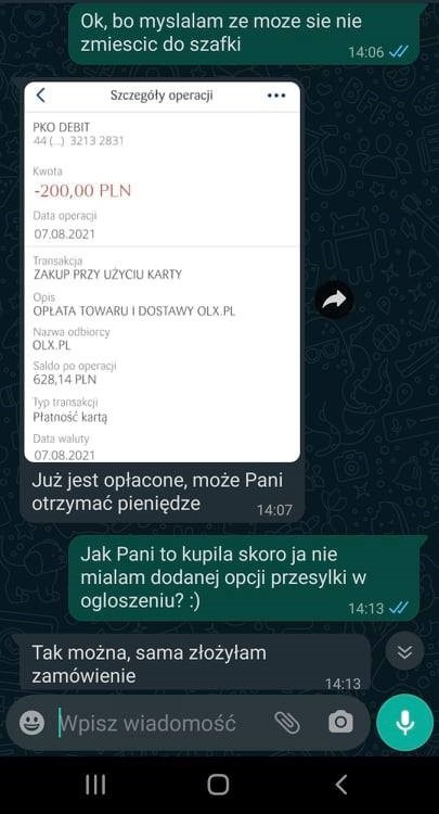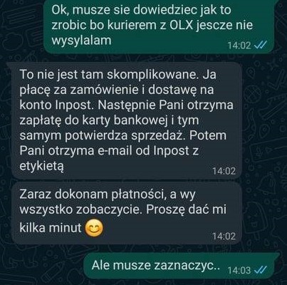 Poniżej screeny z korespondencji ze złodziejem podczas próby wyłudzenia. Korespondencję udostępniły osoby, która niemal zostały oszukane, ale były sprytniejsze i urwały kontakt.