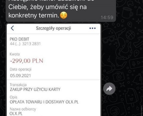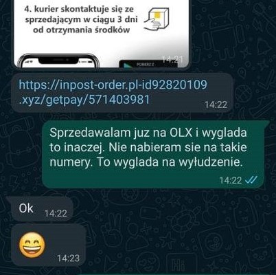 – Twierdzi, że na nasze konto w olx, nalega, żeby kliknąć w link i postępować zgodnie z instrukcjami. Wtedy dostaniemy pieniądze. Mam klikać?