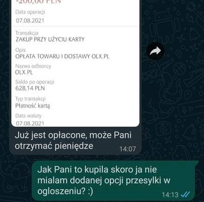 Złodziej kontaktuje się ze sprzedającym przez mail lub komunikator (zazwyczaj Whatsapp) i udaje zainteresowanego kupca zadając serię pytań. Zauważ, że często pytania są uniwersalne i pasują do każdego przedmiotu sprzedaży (może być planszówka lub bielizna męska). Dodatkowa wskazówka: często kupujący pisze z taką składnią, jakby skończył naukę polskiego na podstawówce. Dzieje się tak, bo złodziej używa translatora. Oszust dąży do jednego, żebyś kliknął w link, który Ci podeśle. Trafisz na fałszywą stronę olx, która wygląda bardzo wiarygodnie. Będziesz tam poproszony o dane personalne lub numer karty, żeby otrzymać pieniądze za zakupiony produkt. Tyle wystarczy do kradzieży. Jeśli podasz dane dostępowe do konta, a na koniec kod z sms-a, oszust spokojnie wyczyści Cię z kasy.