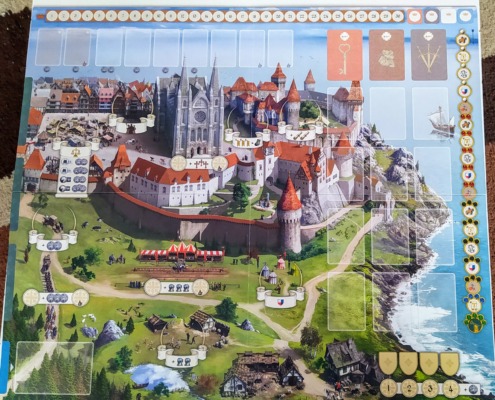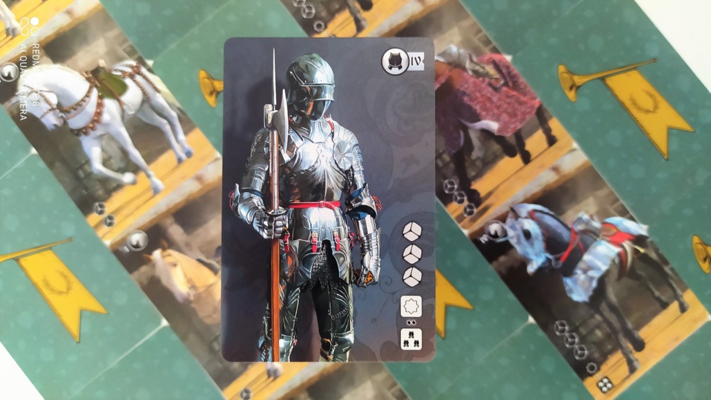 W trakcie gry odbędą się trzy turnieje. Jak daleko w nich znajdziesz przełoży się na punkty zwycięstwa. Przed każdym turniejem jest faza przygotowania, w której zdobywasz fundusze, trenujesz, prosisz Boga o błogosławieństwo, kompletujesz zbroję, ćwiczysz rumaka i gromadzisz pomocników. W tym etapie wykorzystano mechanikę worker placement. Pionami rezerwujesz wybrane akcje, nigdy nie zrobisz wszystkiego, więc wybieraj mądrze. Na jednym z pól możesz dobrać karty. Niektóre zawierają natychmiastowe bonusy, za inne trzeba zapłacić, są też karty z przeciwnikiem, za pokonanie którego zbierzesz konkretne nagrody. Warto zawsze mieć kilka tych kart w zapasie, bo wykorzystasz je w następnym etapie gry. Możesz zapisać się do turnieju. Robiąc to teraz możesz przebierać w przeciwnikach. Czasem wybranie słabszego na początek pozwoli wspiąć się wyżej w drabince turniejowej, z kolei w potyczkach na końcu gry rozchwytywani są silniejsi rycerze, bo pokonanie ich przynosi więcej punktów chwały. Na planszy znajdziesz też pole z zadaniami pobocznymi. Takie misje, które niby robi się „na boku”, a przynoszą na tyle dużo punktów, by zdecydować o zwycięstwie. Trzy z takich misji są jawne i każdy z graczy może je realizować do końca gry. Kolejne zadania można dobrać i realizować indywidualnie. Na czym polegają misje? Na zgromadzeniu odpowiednich zasobów (np. żetony siły, błogosławieństwa, pomocników). Czasem jest to trudne, bo zasoby są ci potrzebne do turnieju. Ostatnie z pól na planszy pozwala zmienić kolejność w następnej turze. Niestety wymaga poświęcania jednego z pionów, a tych jest ograniczona ilość.