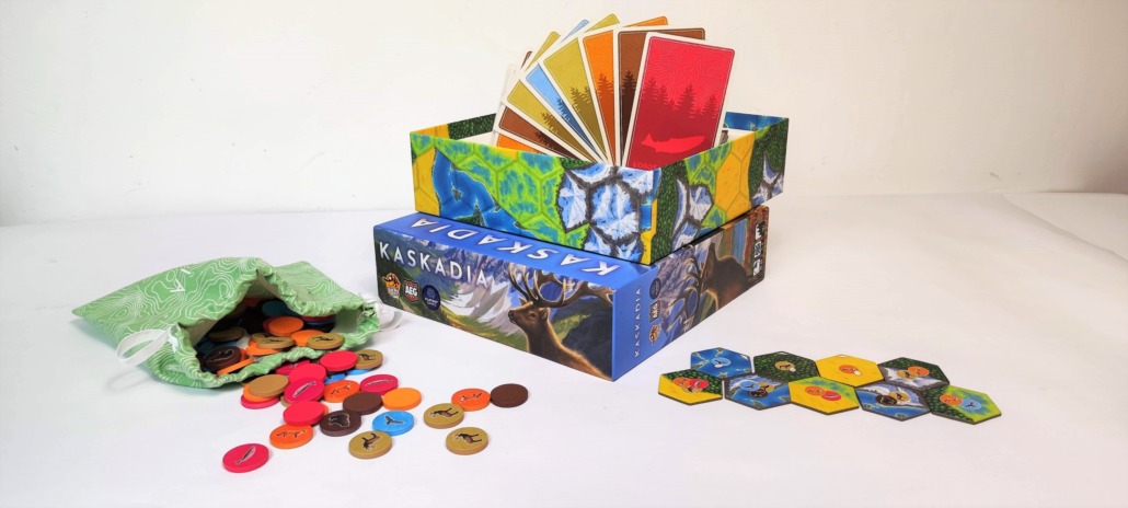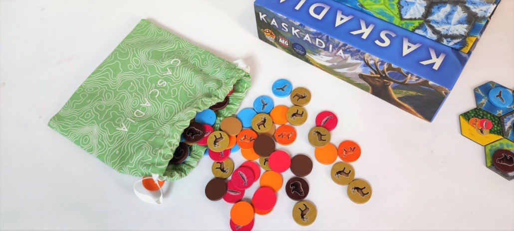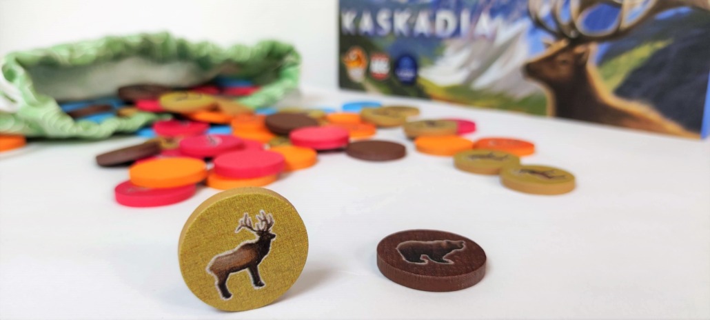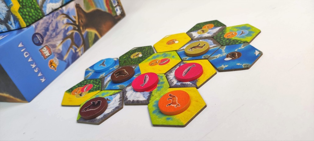 Łosiów nie ma (może będą w dodatku), ale są łososie, lisy, niedźwiedzie, rybołowy i krowy z rogami, czyli jelenie. Wizerunki zwierząt znajdują się na drewnianych dyskach. Każdy gatunek ma swój kolor, dzięki czemu dyski łatwo odróżnić. Wszystkie zwierzaki wrzucasz na początku zabawy do woreczka i stamtąd losujesz. Zwierzęta mają dedykowane karty, które określają jak należy układać dyski danego gatunku, by zdobywać punkty zwycięstwa. Lisy są towarzyskie i lubią, gdy w pobliżu są inne zwierzęta, z kolei niedźwiedzie nie lubią tłumów. Żyją samotnie lub w parach. Podobnie myszołowy, te ptaki mają duże żerowisko i nie tolerują innych drapieżników na swoim terenie. Z kolei jelenie są zwierzętami stadnymi. Im większa ich grupa, tym więcej punktów zdobędziesz. Łososie płyną ławicą, przedkładając to na język gry – układasz je w ciągu.
