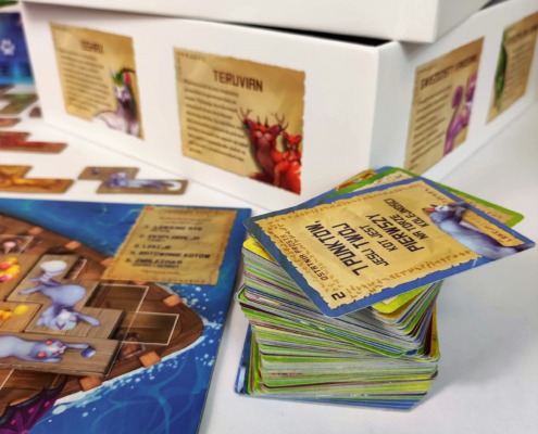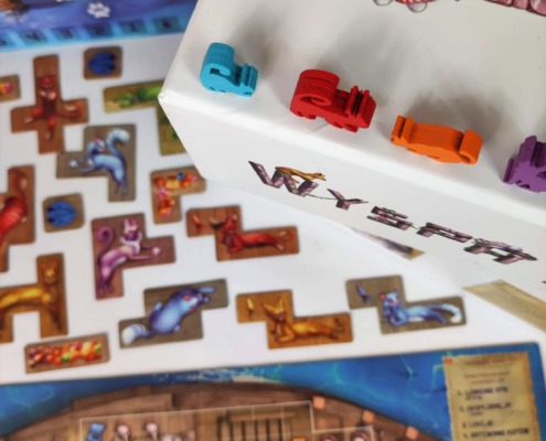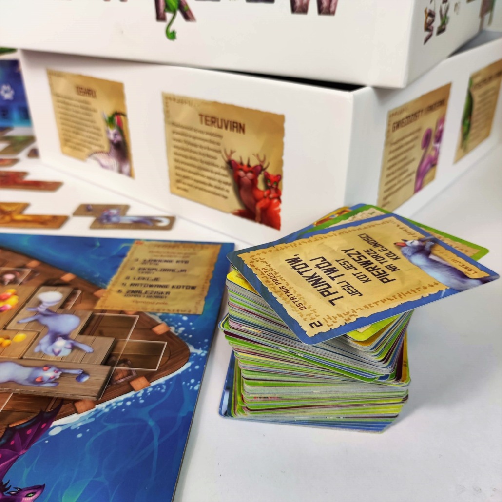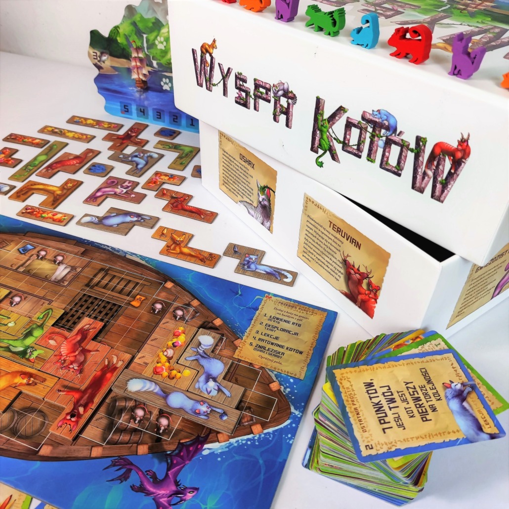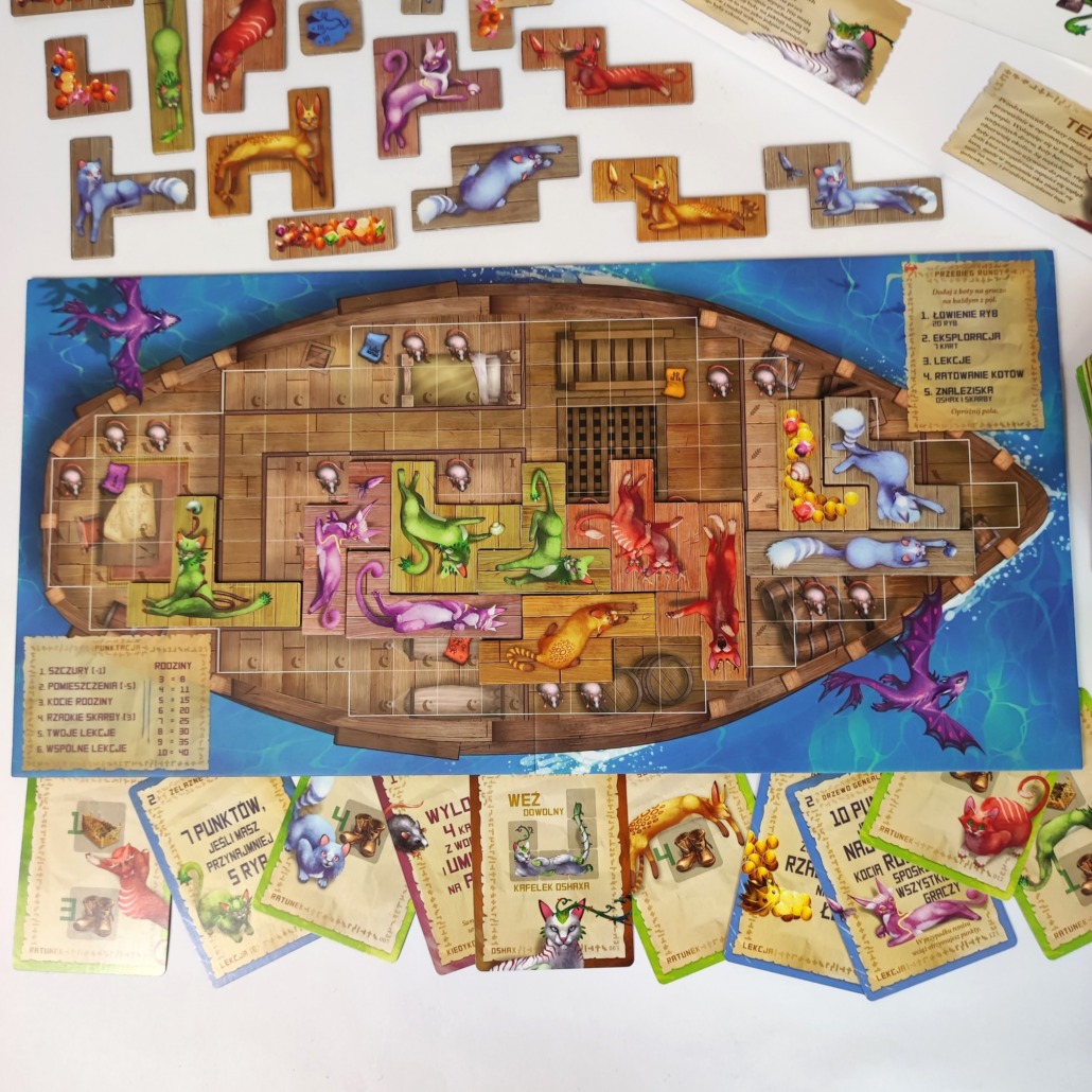 Jeśli zostały Ci ryby, możesz je teraz wykorzystać, żeby zwabić koty. Oprócz ryb potrzebujesz też koszy. Koty są przestraszone, dadzą się zanieść na łódź tyko w koszach. Kiedy umieszczasz koty na łodzi, pamiętaj o kilku zasadach: zwierzaki lubią przebywać w rodzinach, dlatego układaj obok siebie koty o tym samym umaszczeniu. Na łodzi są szczury, postaraj się je wygonić. I jeszcze, jakby było mało, łódź składa się z kilku pokładów. Zapełnij jak najwięcej z nich, żeby nie dostać punktów ujemnych. Żetony kotów są niczym innym jak terisowymi kafelkami (podobne kształty znajdziesz na przykład w Ubongo), a łódź jest planszą, na której musisz zgrabnie kotki ułożyć, tak by było jak najmniej luk i jeszcze musisz pamiętać o kolorach zwierzaków. Wcale nie jest łatwo.