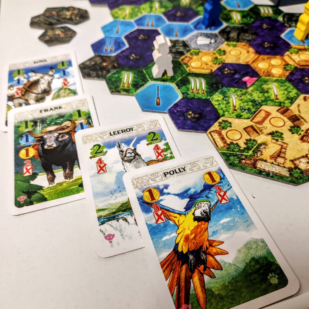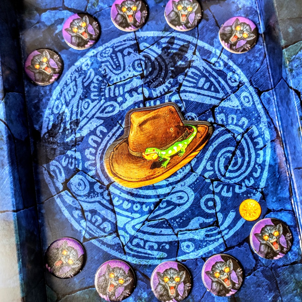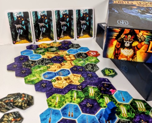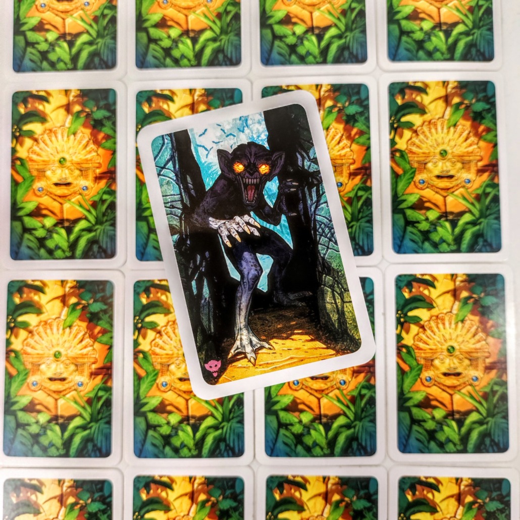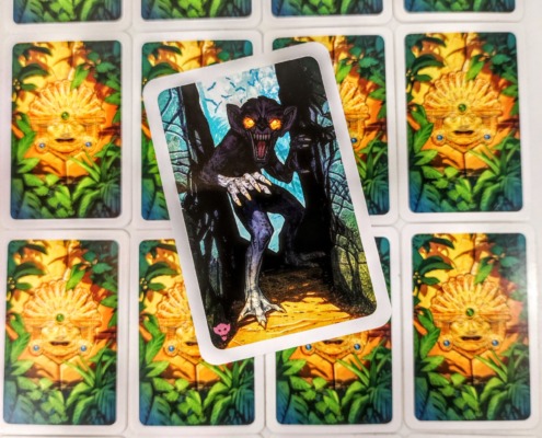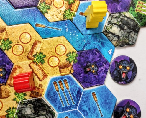 Dostajesz trzy nowe, dwustronne plansze. Są na nich przeklęte obszary i podziemne tunele. Korzystając z tunelu oszczędzasz kawał czasu (taki teleport) ale za karę ciągniesz żetony klątw. Może brzmi złowieszczo, ale nie powinnaś się bać. Podróż przez mroczniejsze rejony dżungli po prostu się opłaca. Klątwy są różne ale zawsze cię ograniczają. Na przykład nie możesz grać odpowiednich kart dopóki nie zapłacisz kary albo tracisz ruch albo gorzej przeciwnicy mogą cię cofnąć. Karą jest również dobranie karty demona, To typowy zapychacz talii. Ma małą użyteczność i blokuje rękę na szczęście można się go pozbyć.
